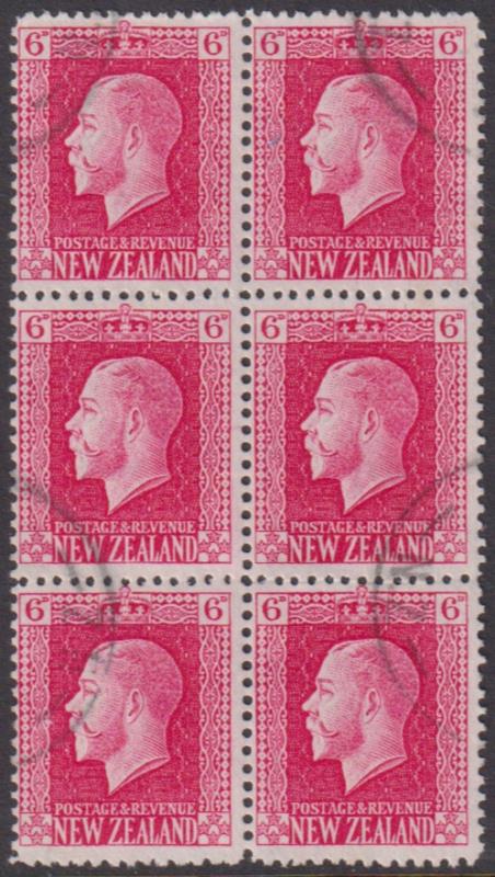1916 6d GV vert block of 6, line p14, sideways wmk, incl bottom 2 with no wmk variety. CP K8d/z. Cat $2000. VFU/CTO. (Image)