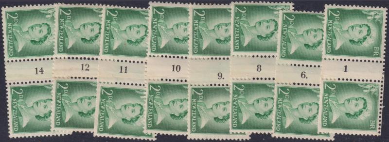 1956 2d QEII green horiz counter coil pairs, large figures, with numbers reading upwards. Range of 8 diff No's: 1, 6. (with