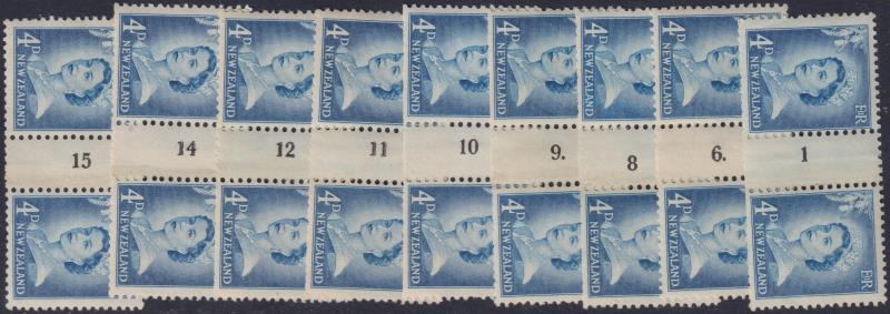 1958 4d QEII ultramarine horiz counter coil pairs, large figures, with numbers reading upwards. Range of 9 diff No's: 1, 6.