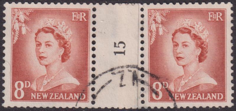 1960 8d QEII large figures coil pair, No 15 reading upwards. CP NC8(d). Cat $65 (as mint). FU. (Image)