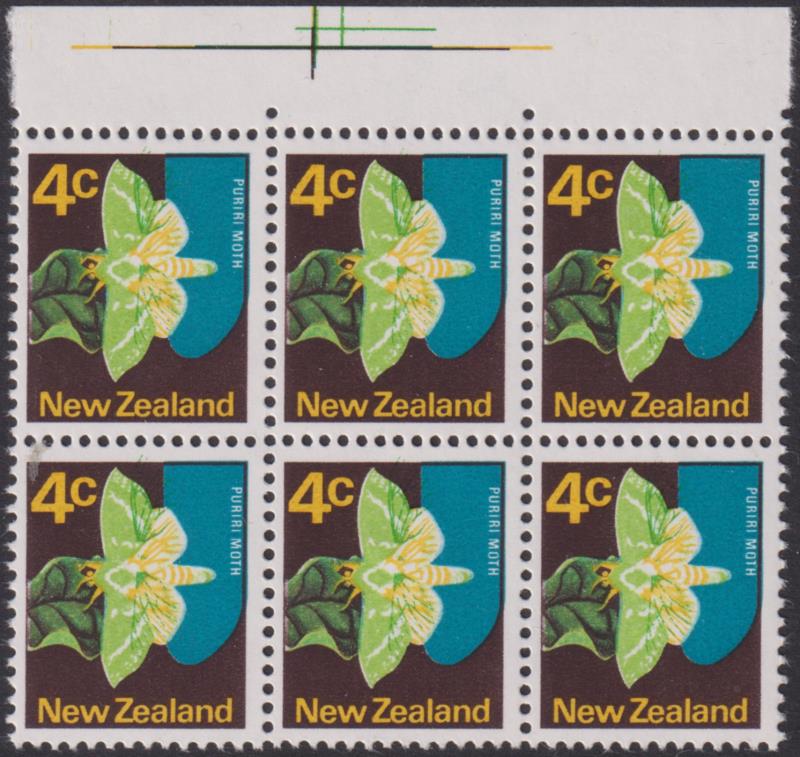 1973 4c Moth horiz block of 6 with top selvedge incl colour guide bars, wing veins shifted approx 4mm right & 2mm upwards, no