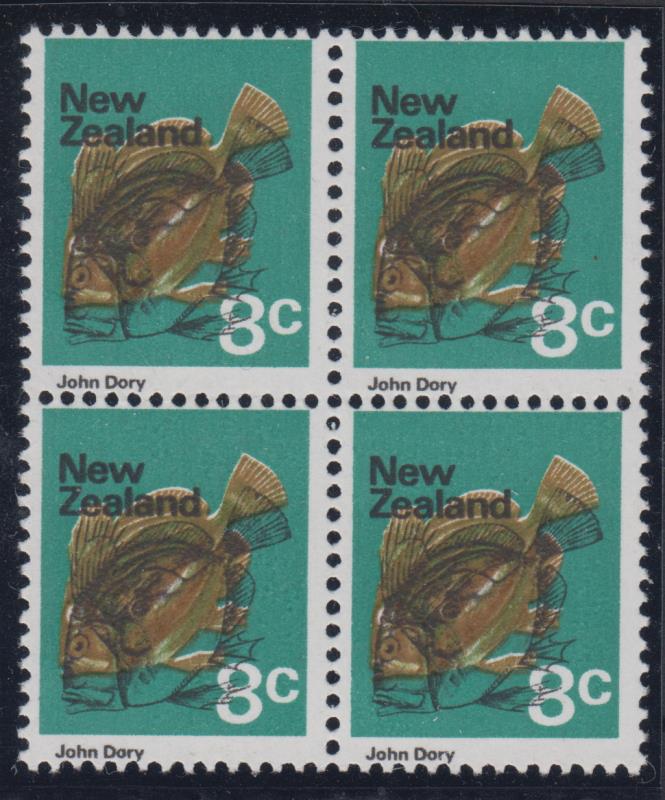 1974 8c John Dory (fish) block of 4, black colour shift 2½mm downwards ("John Dory" in lower margin, fins over "8c"), no wmk.
