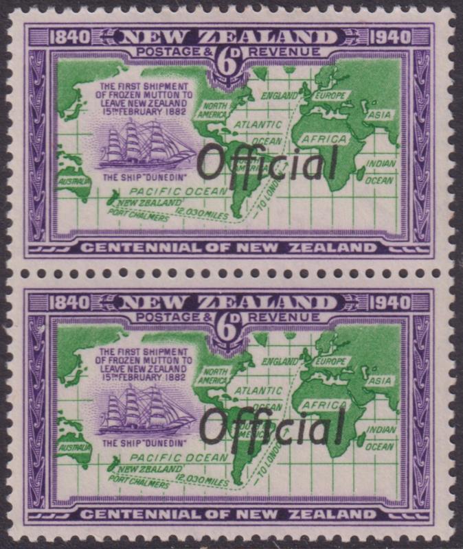 1940 6d Centennial vert pair, ovpt variety R1/10 "joined ff" with normal (variety hinged). CP SO34a(z). Cat $90.