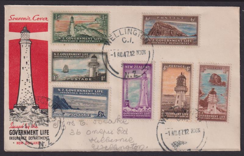 1947 ½d-1/- Lighthouses set of 7 on pictorial GLIO FDC (no 2½d, issued later), canc Wellington cds 1 AU 47. Pencilled