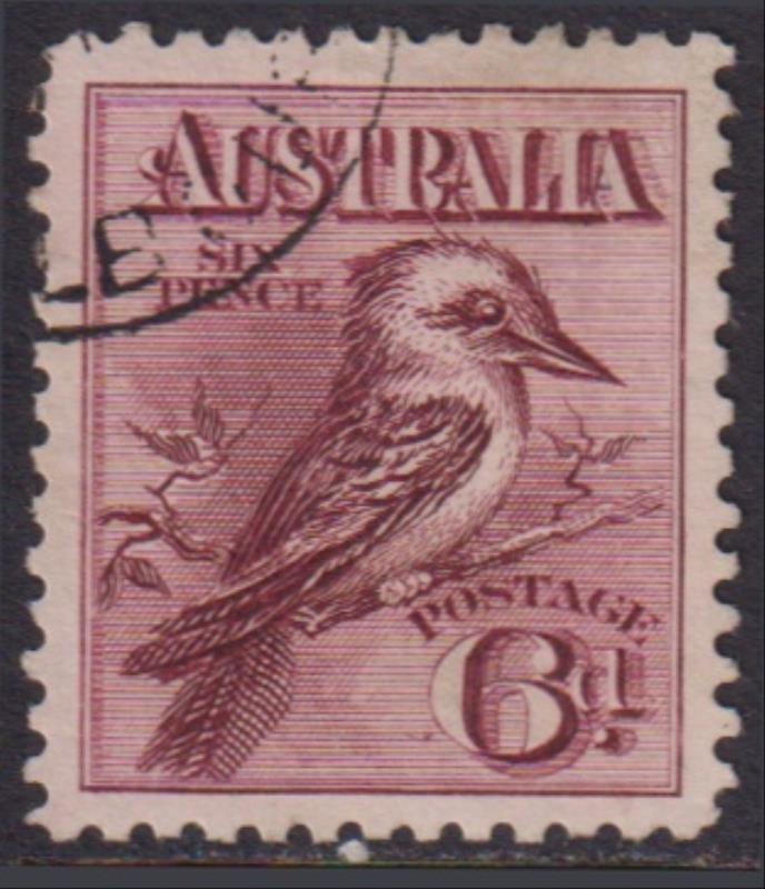1914 6d Kookaburra claret, minor buckle on reverse. Crisp, light cds. SG 19. Cat £60. FU. (Image)
