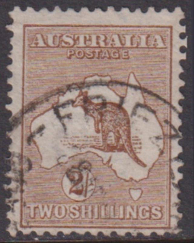 1913 2/- Roo brown, 1st wmk (horiz mesh), o/c to bottom. SG 12. Cat £110. FU. (Image)