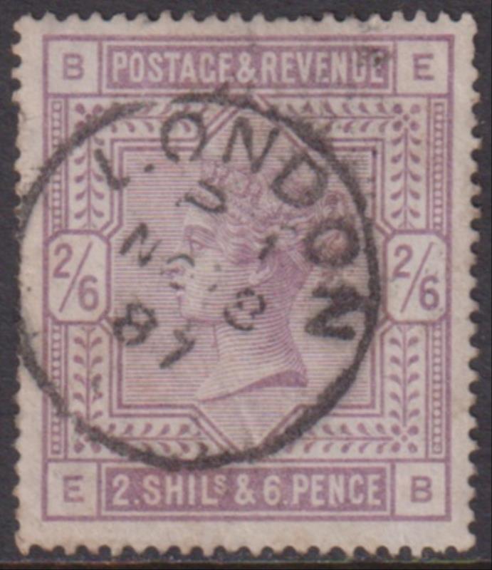 1884 2/6d lilac (BE/EB), white paper, canc near complete London steel cds. SG 178. Cat £100. FU. (Image)