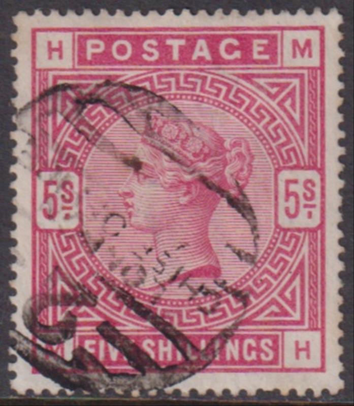 1884 5/- rose (HM/MH), white paper, canc "2 / LONDON / CHIEF OFFICE" rubber h/s. Sound. SG 180. Cat £130. GU. (Image)