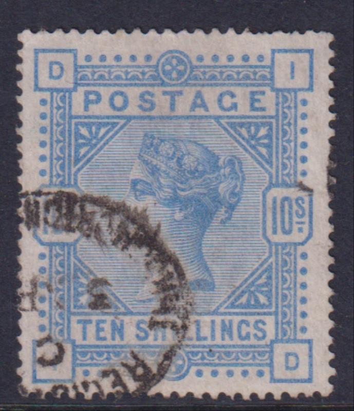 1884 10/- ultramarine (DI/ID), white paper, canc steel d/s in corner but overinked. SG 183. Cat £375. GU/FU. (Image)