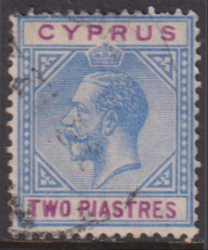 Cyprus 1921 2pi GV blue & purple, p14, mult script CA wmk. SG 92. Cat £30. FU. (Image)