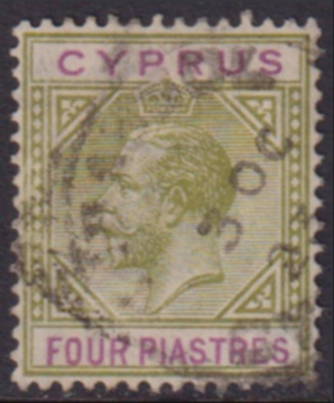Cyprus 1921 4pi GV olive-green & purple, mult script CA wmk. SG 95. Cat £25. FU. (Image)