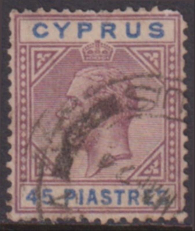 Cyprus 1923 45pi GV dull purple & ultramarine, p14, mult CA script wmk, short corner at top right. Top value. SG £300.