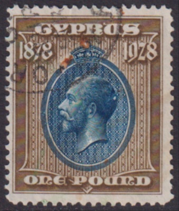 Cyprus 1928 £1 50th Anniv of British Rule, significant surface faults & pinholes. SG 132. Cat £325. Used. (Image)