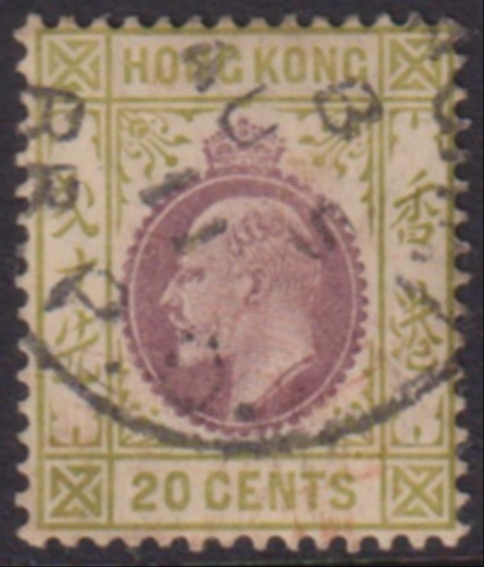 Hong Kong 1911 20c EVII purple & sage-green, mult crown CA wmk. SG 96. Cat £55. FU. (Image)