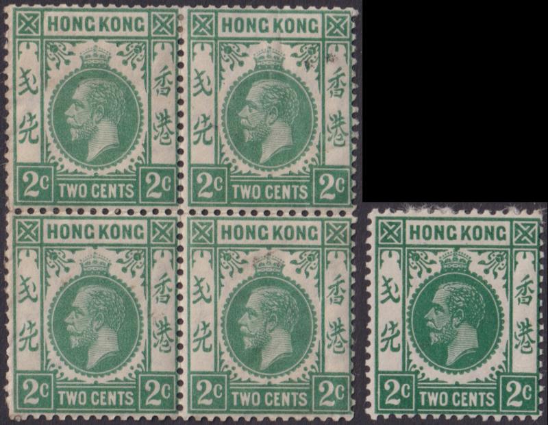 Hong Kong 1912 2c GV block of 4 green & deep green single. SG 101a & 101. Cat £23 single green & £19 deep green. Cat £116.