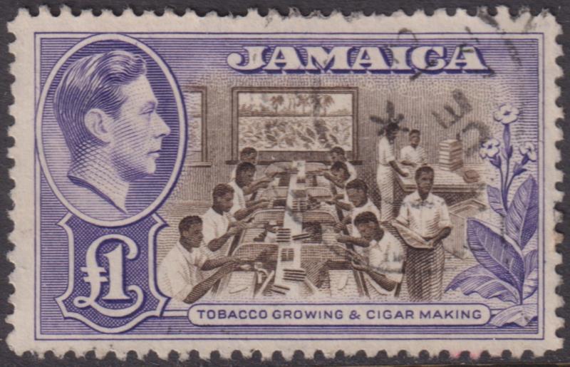 2961 U imageJamaica 1949 £1 GVI & Tobacco Growing. SG 133b. Cat £45. FU. (Image)
