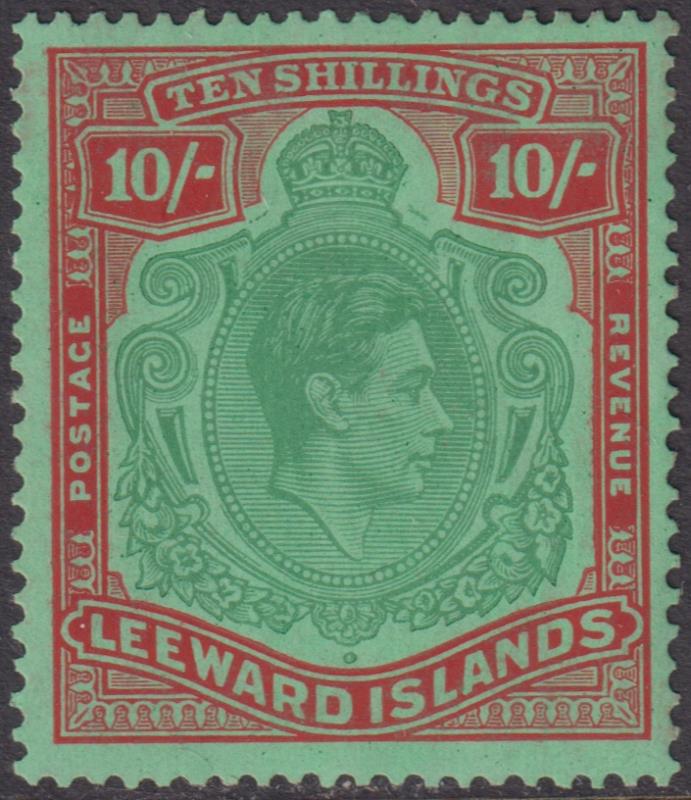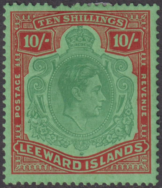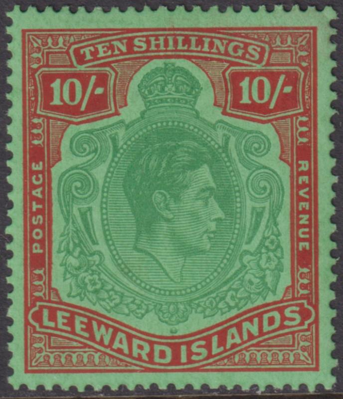 2975 M imageLeeward Isl 1947 10/- GVI deep green & deep vermilion on green, ordinary paper. SG 113c. Cat £100. VLH mint. (Image)