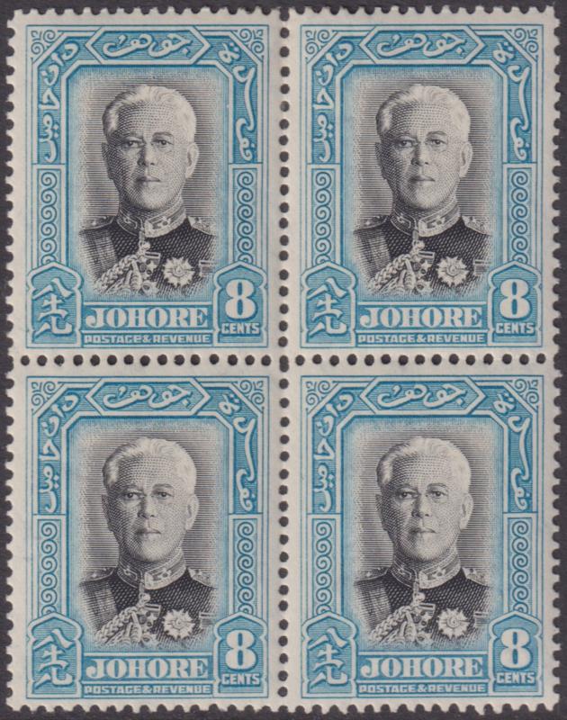 2980 * imageMalaya-Johore 1940 8c Sultan Sir Ibrahim fresh block of 4. SG 130. Cat £112. MUH. (Image)