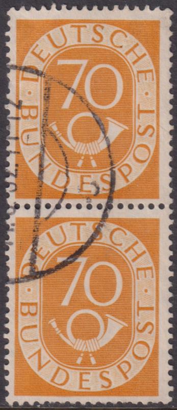 3269 U imageGermany-West 1951 70pf Numeral & Posthorn yellow vertical pair. SG 1058. Cat £52. VFU. (Image)