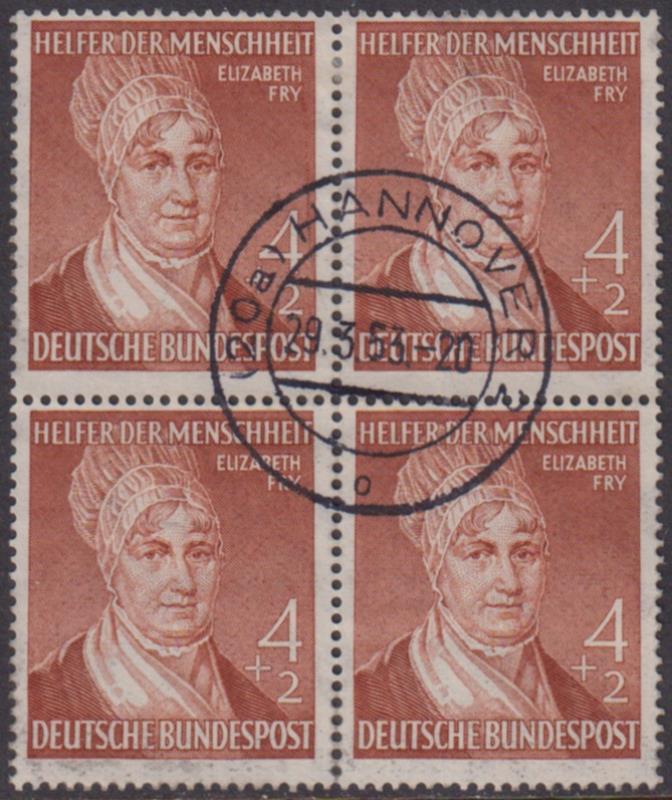 3270 U imageGermany-West 1952 4pf + 2pf Elizabeth Fry block of 4. SG 1082. Cat £40. FU. (Image)