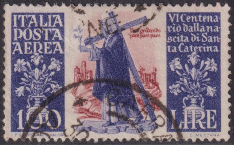 Italy 1948 100L St Catherine of Siena violet & red-brown. SG 702. Cat £65. FU. (Image)