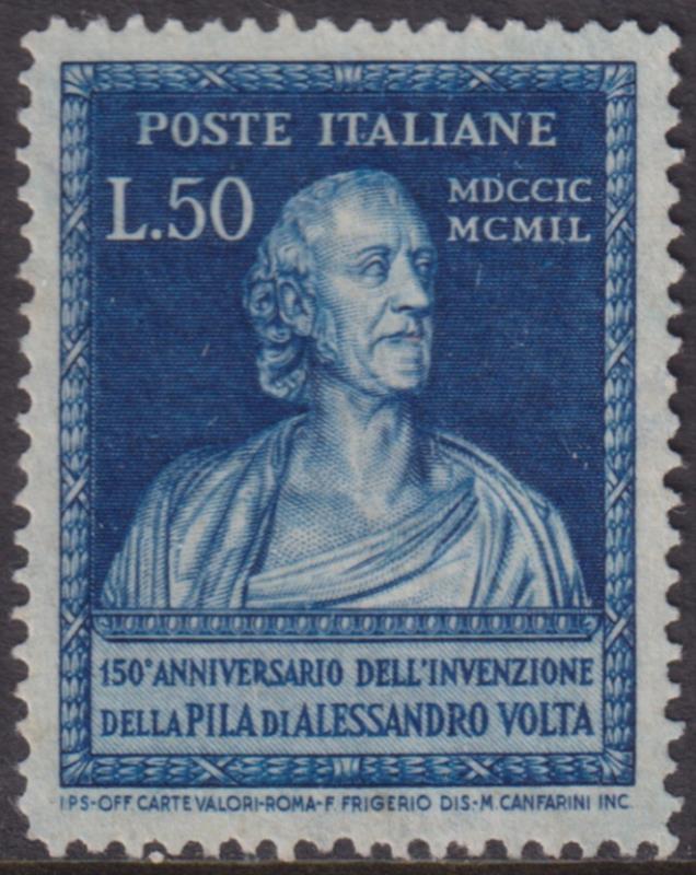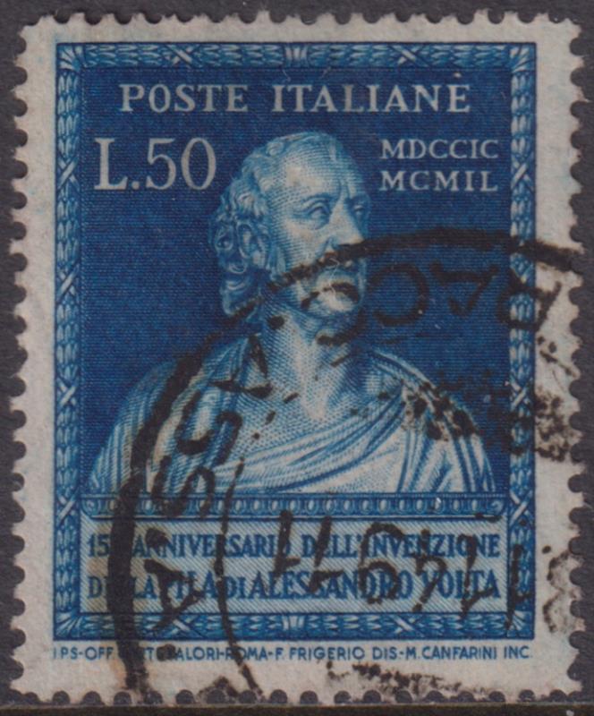 Italy 1949 50L 150th Anniv Volta's Electric Cell blue, p14. SG 738. Cat £55. FU. (Image)