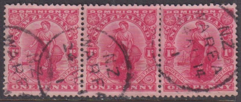 Warea (NU 1898-1949) 2 fine strikes of A-type cds 24 AU 14 on strip of 3 x 1d Dominion. (Image)