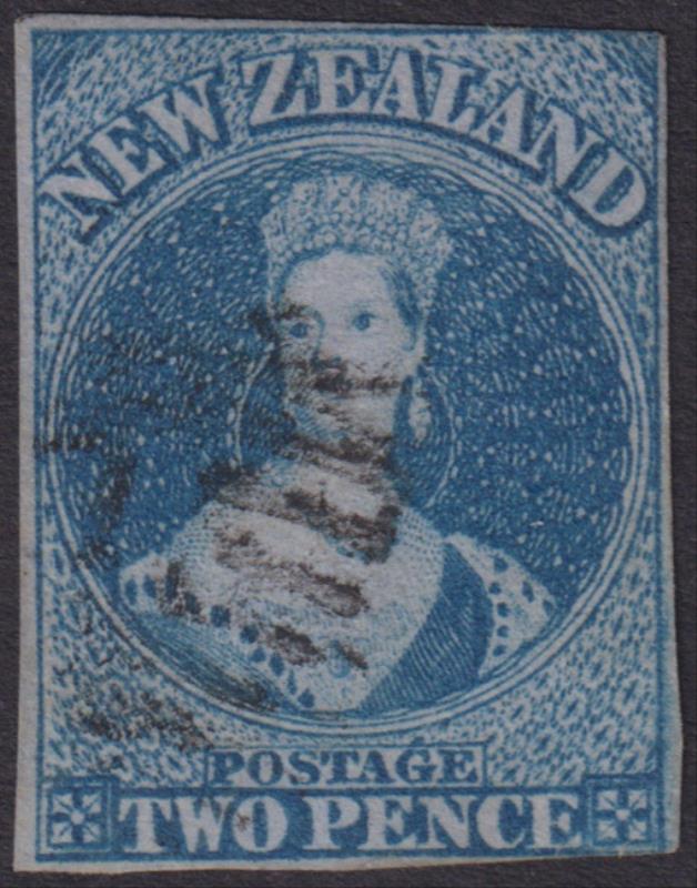 716 U imageFFQ 2d blue on blue paper, imperf nearly 4 margins but 2 touch frame, barred canc part on face, authenticated by Brun on reverse. SG 5. Cat £325. FU. (Image)