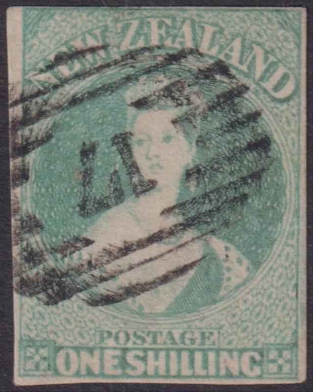 718 U imageFFQ 1/- dull emerald-green, imperf 4 margins very close at top & close on right & base, no wmk. Very light back thin as usual. Barred "17" cancel (bold letters, Rangiora). SG 16. Cat £1900. (Image)