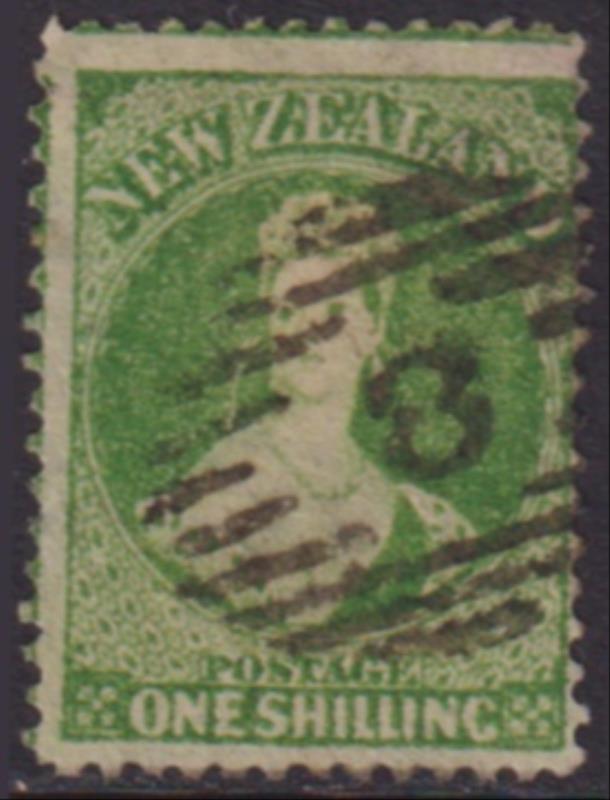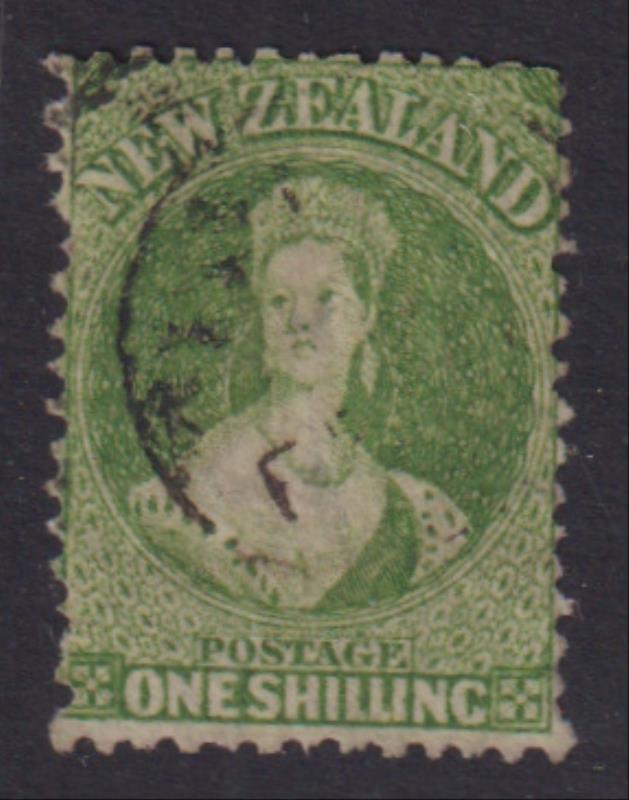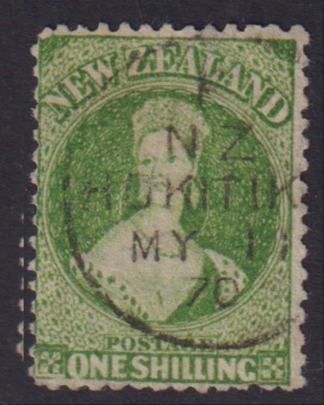 750 U imageFFQ 1/- yellow-green, p12½, star wmk, Hokitika cds. SG 125. Cat £160. FU. (Image)