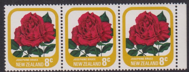 1976 8c Rose, p14¼ x 13¾, error: red & green offset - horiz strip of 3, with one complete example & another about 75%. CP
