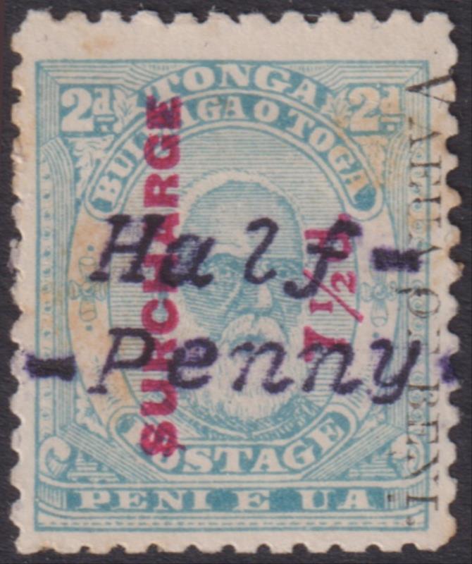 2542 M imageTonga 1896 ½d on 7½d on 2d King George I pale blue, p12, "HALF PENNY" shifted to right. Tongan surcharge reading down. SG 37A. Cat £85. Mint. (Image)
