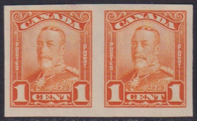 Canada 1928 1c GV orange horiz imperf pair. SG 275 var. Cat £120+. Mint. (Image)