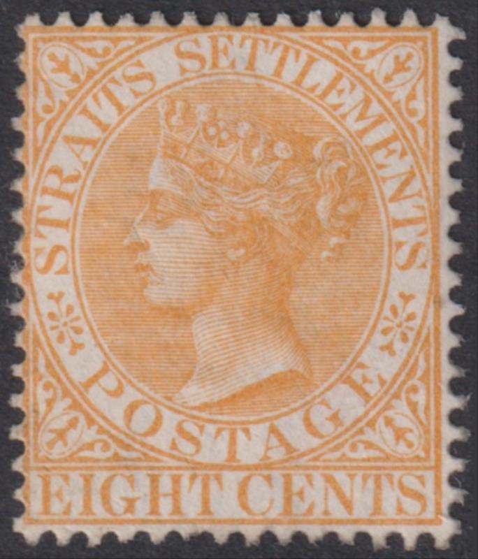 3069 M imageMalaya-Straits Settlements 1867 8c QV orange-yellow, wmk crown CC, p14. SG 14. Cat £275 as mint. Unused no gum. (Image)