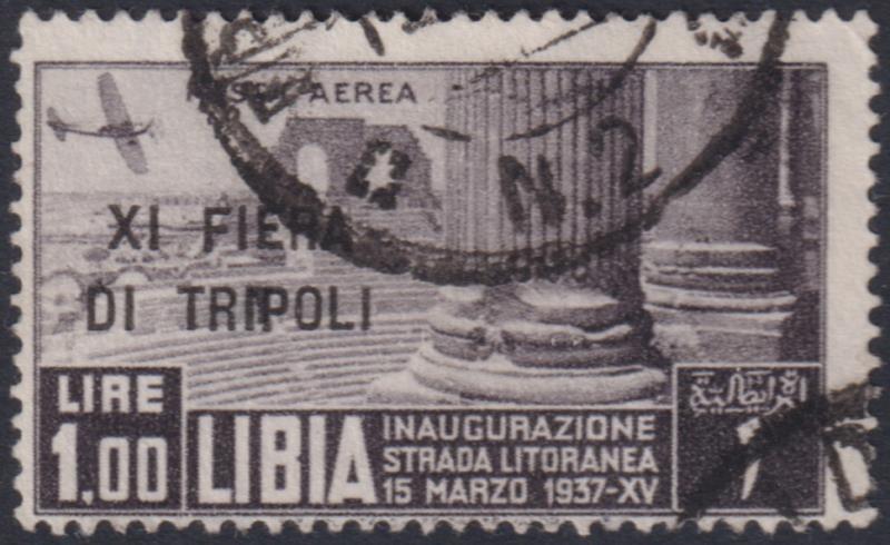3374 U imageLibya 1937 1L 11th Tripoli Trade Fair ovpt on 1937 Highway Opening black. Airmail. SG 87. Cat £50. GU/FU. (Image)
