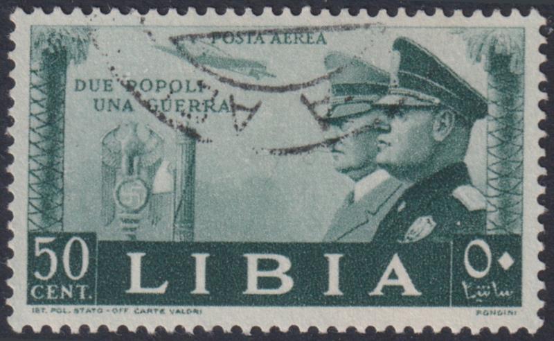 3375 U imageLibya 1941 50c Rome-Berlin Axis (Hitler & Mussolini) blue-green, airmail. SG 130. Cat £40. FU. (Image)