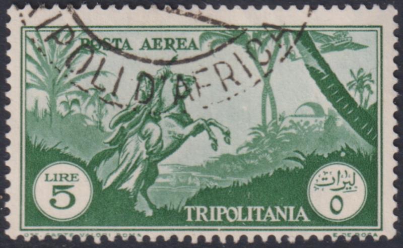 3382 U imageLibya-Tripolitania 1931 5L Airmail green (plane over horse & rider). SG 122. Cat £35. Top value. (Image)