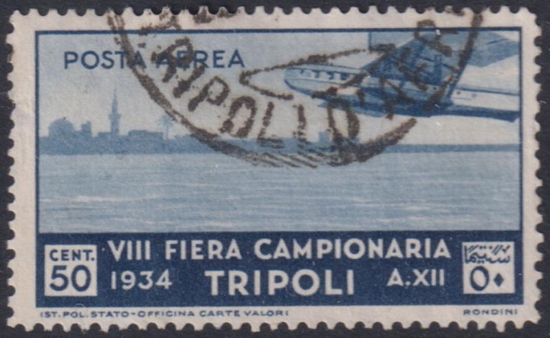 3383 U imageLibya-Tripolitania 1934 50c 8th Tripoli Trade Fair grey-blue (flying boat over Tripoli) Airmail. SG 190. Cat £29. FU. (Image)