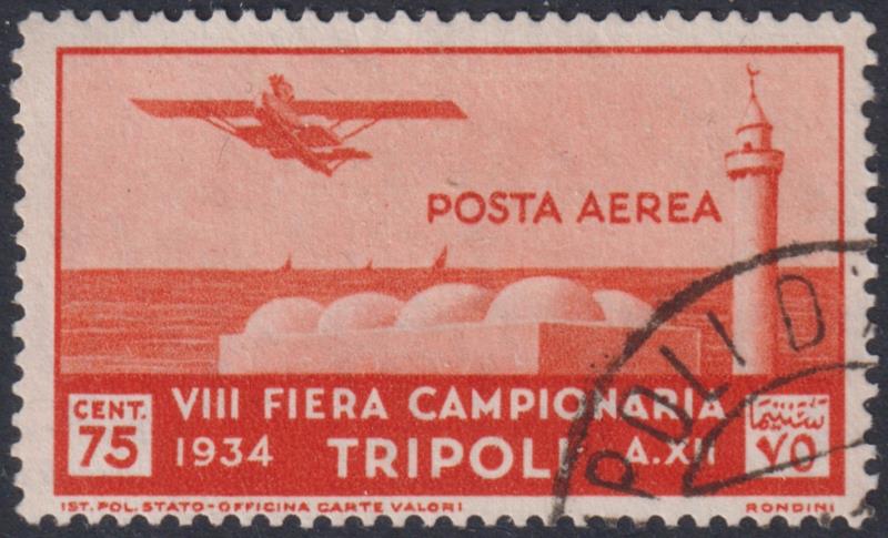 3384 U imageLibya-Tripolitania 1934 75c 8th Tripoli Trade Fair orange (plane over desert mosque) Airmail. SG 191. Cat £29. FU. (Image)
