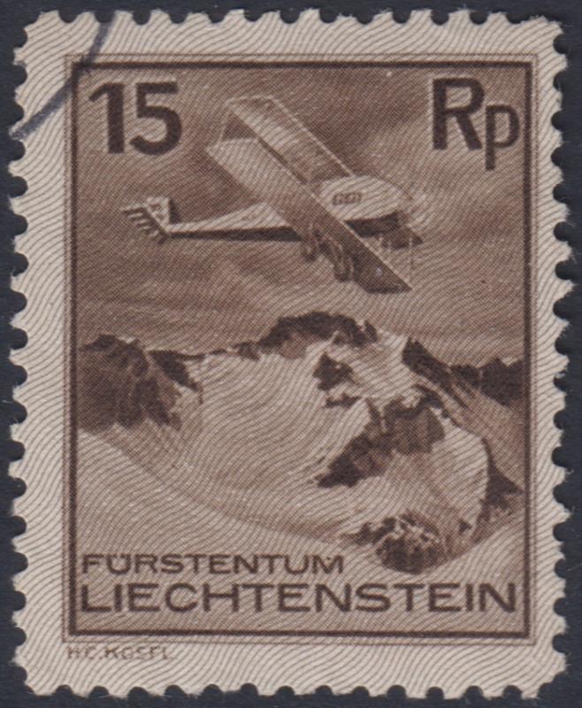 3385 U imageLiechtenstein 1930 15r Air sepia (biplane over mountain). SG 110. Cat £24. FU. (Image)