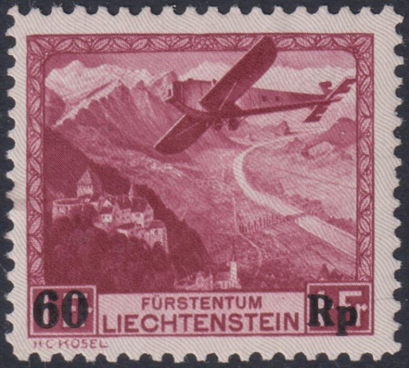 3387 M imageLiechtenstein 1935 60c on 1F Air claret (plane over castle), small adhesion on gum. SG 150. Cat £60. Mint. (Image)