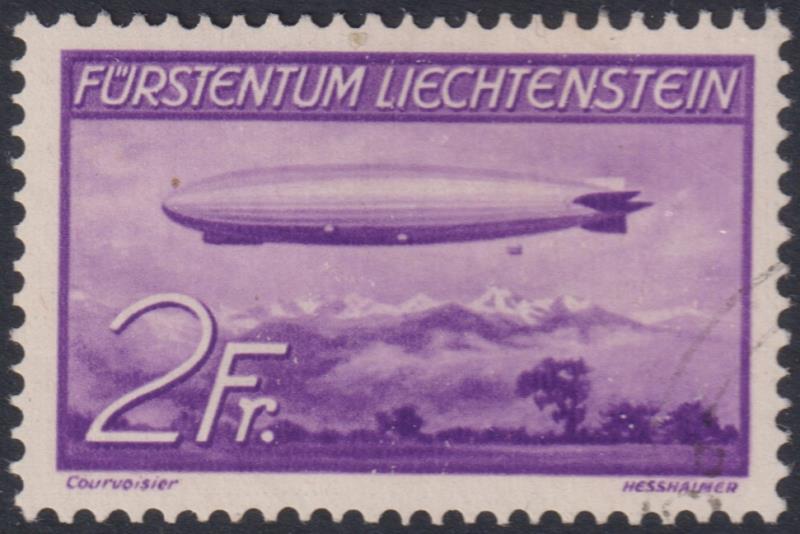 3388 U imageLiechtenstein 1936 2F Air bright violet (airship "Hindeburg" over mountains), faint corner cds cancel. SG 152. Cat £150. FU. (Image)