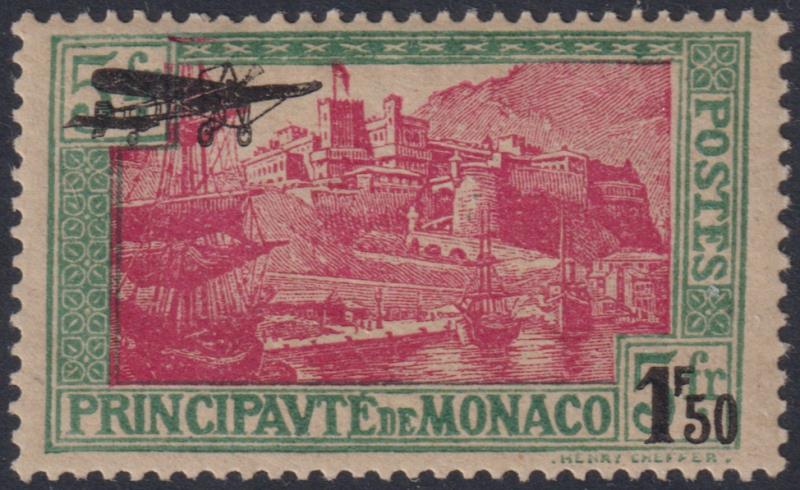 3399 M imageMonaco 1933 1F50 ovpt (in black) on 1924 5F Monaco Castle red & green. Airmail. Outline of early monoplane as part of ovpt. SG 143. Cat £42. Mint. (Image)
