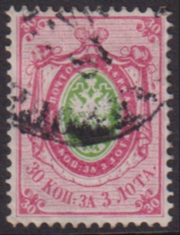 Russia 1865 30K green & carmine-rose, p14½ x 15, wove paper, no wmk. SG 17. Cat £90. GU. (Image)