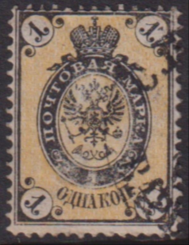 Russia 1866 1K black & orange-yellow, p14½ x 15, vertical laid paper. SG 24. Cat £130. FU. (Image)