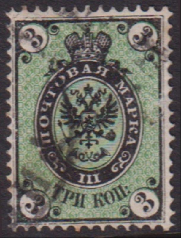 Russia 1866 3K black & green, p14½ x 15, vertical laid paper. SG 25. Cat £130. FU. (Image)