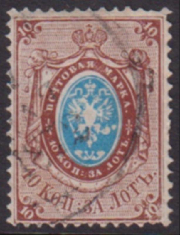 Russia 1866 10K blue & brown, p14½ x 15, vertical laid paper. SG 27. Cat £65. FU. (Image)