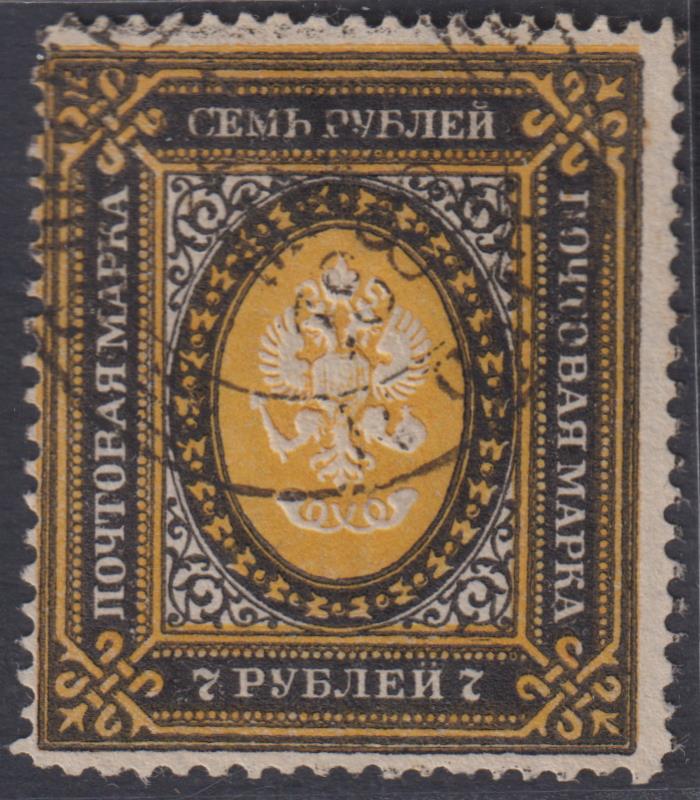 Russia 1884 7R Posthorns without thunderbolts, lemon-yellow & black, vert laid paper. Crisp, light 1888 dated cancel. Cert