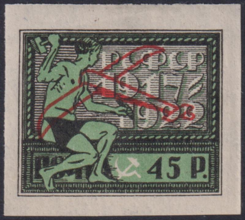 Russia 1922 45R Air 5th Anniv of Revolution black & turquoise-green, with aeroplane outline ovpt, imperf. SG 284. Cat £125.