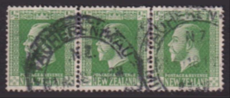 (TAUHERENIKAU & TAUHEREN- MI-) on strip of 3 x ½d GV. Scarce. (Image)